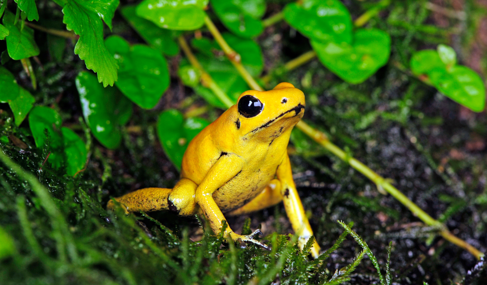 Der Schreckliche Pfeilgiftfrosch (Phyllobates terribilis) ist eine der giftigsten Amphibienarten der Welt und gehört zur Familie der Baumsteigerfrösche (Dendrobatidae). Diese kleine Froschart ist durch ihre leuchtend gelbe Färbung und glatte Haut charakterisiert, wobei einige Individuen auch grünliche oder orange Farbtöne aufweisen können. Der Schreckliche Pfeilgiftfrosch hat eine Körperlänge von etwa 3 bis 5 Zentimetern und lebt in den tropischen Regenwäldern der westlichen Andenregion Kolumbiens.