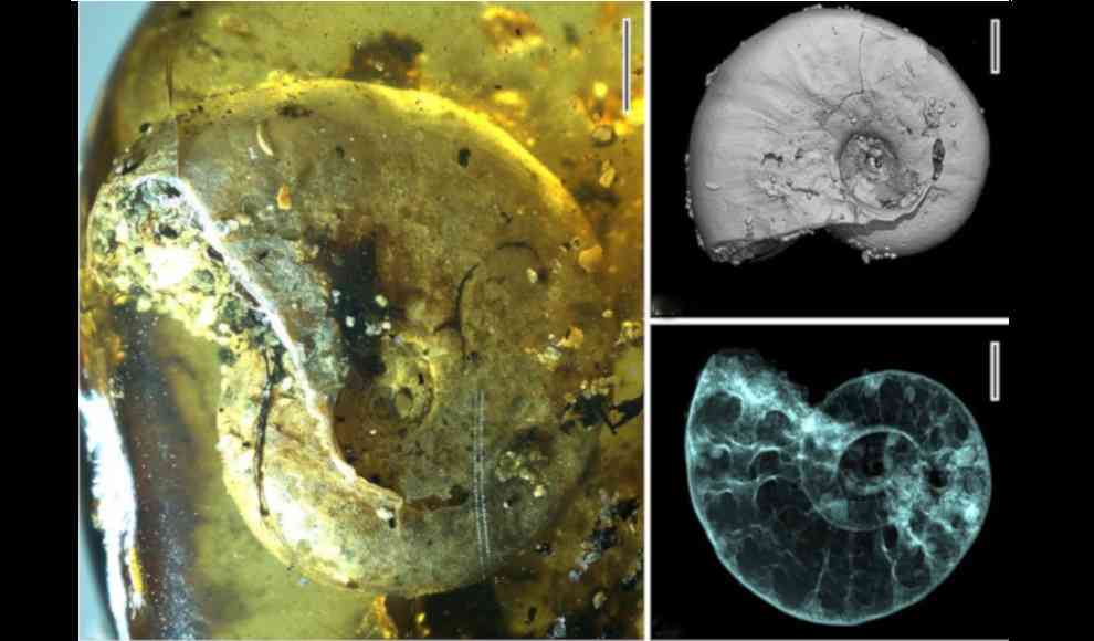 Gefunden wurde der junge Ammonit eingeschlossen von Burma-Bernstein in Myanmar. In dem etwa 99 Millionen Jahre altem Fund, sind neben dem Kopffüßer noch mindestens 40 andere Lebewesen konserviert, darunter Milben, Spinnen, Insekten sowie Meeressschnecken. Mithilfe der Röntgen-Mikro-Computertomografie haben die Wissenschaftler ein 3D-Modell es eingeschlossenen Ammoniten erstellt, das dabei helfen soll mehr über das Leben des ausgestorbenen Meeresbewohners zu erfahren.